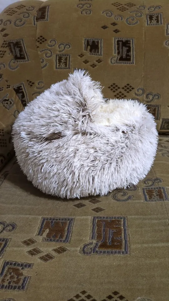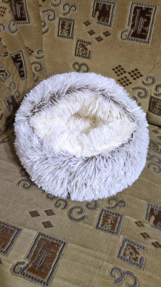 The pillow arrived compressed by vacuum in a flat disc. However, after opening the package, it literally regained its shape within a few minutes and looks great. Unfortunately, in reality, its diameter is smaller than stated. The "40x40" model is actually approximately 35x37cm. Suitable for tiny pocket-sized dog breeds, but this pillow is too small for an adult cat.